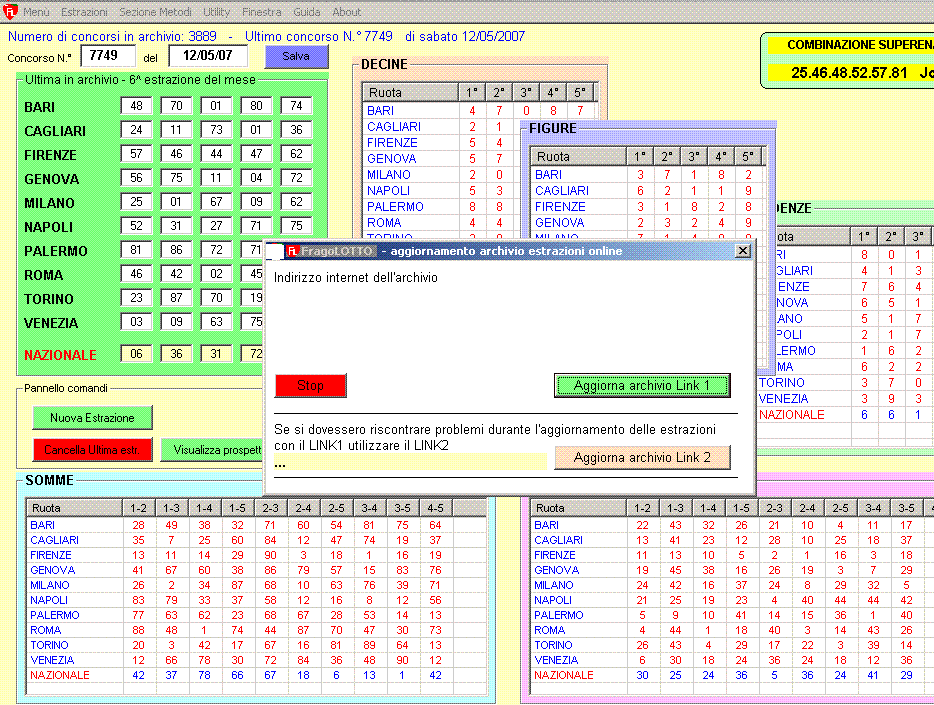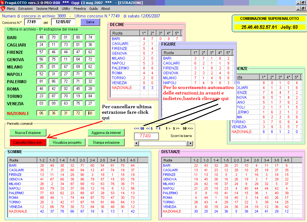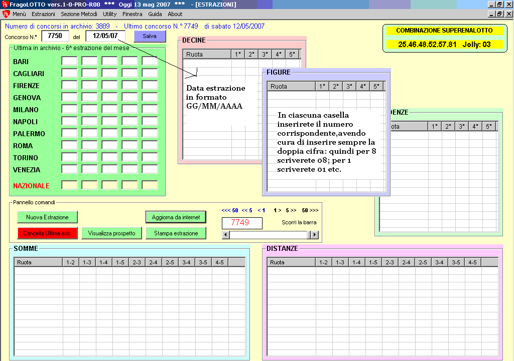 Iniziamo il nostro tour guidato, partendo dal pannello estrazionale, ove impareremo l'inserimento di una nuova estrazione, la modifica della stessa, la stampa e la eliminazione. Inserimento di una estrazione L'estrazione sarà possibile inserirla manualmente,oppure automaticamente collegandoci ad internet. Per l'inserimento manuale, troverete sotto una immagine che vi chiarirà le operazioni da svolgere.