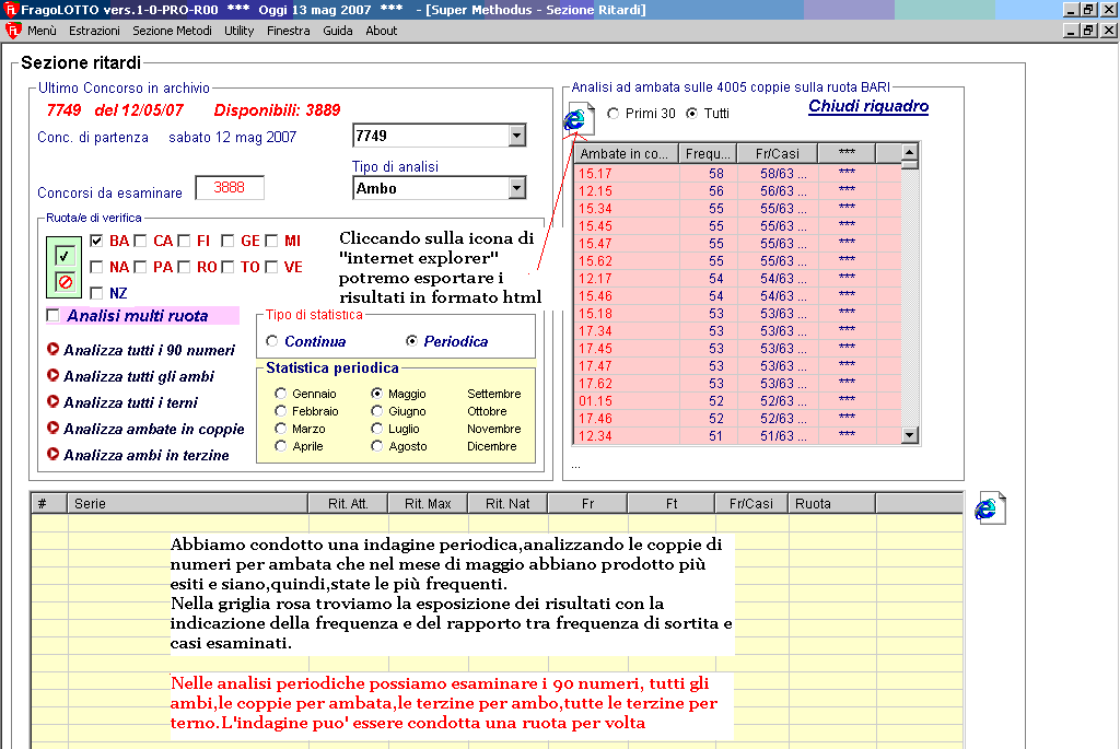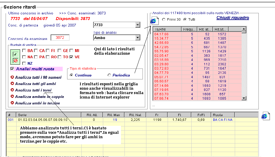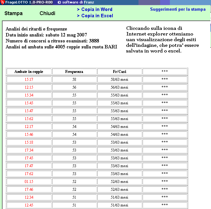 Ritardi e le frequenze In FragoLotto è presente un modulo accessibile dal menù denominato "ritardi". Con tale termine misuriamo l'intervallo estrazionale intercorrente tra la data di sortita di un numero, o una serie numerica e quello della sua ripresentazione. Numeri singoli, coppie per ambata, terzine per ambo e terno, coppie per la sorte di ambo, sono solo alcune delle elaborazioni possibili,sceverabili sia nel continuo che considerando la suddivisione in mesi dell'arco estrazionale. Ad esempio , dire che un numero, o un ambo ritarda da 120 estrazioni, significa evidenziare quanto tempo fa quel numero, o quell'ambo, ebbe a manifestarsi l'ultima volta. Con questa funzione potremo conoscere da quanto tempo manca all'appello un numero semplice oppure una combinazione numerica di interesse, come le cinquine pentagonali, le sestine esagonali, le cadenze, le decine, le figure...e non solo. Saremo noi a scegliere la ruota, saremo noi ad indicare per quale sorte vogliamo sia processata quella formazione numerica ed attraverso una semplice combinazione di tasti otterremo un risultato tabellare completo. Esso ci indicherà il ritardo attuale, quello max, il ritardo naturale o teorico ed anche la frequenza, che rappresenta l'alter ego del concetto di ritardo. L'importanza di queste notazioni risiede nella circostanza che molti ,piuttosto che inseguire i ritardi, pongono maggior fede nella frequenza. La correlazione con il modulo di costruzione della tecnica è evidente: infatti, una volta che avrete realizzato la tecnica ed ottenuto le eventuali previsioni in corso, accedendo alla funzione che stiamo discutendo potrete verificarne la frequenza o il ritardo e decidere se porle in gioco in base al personalissimo criterio col quale siete portati a scegliere le combinazioni.