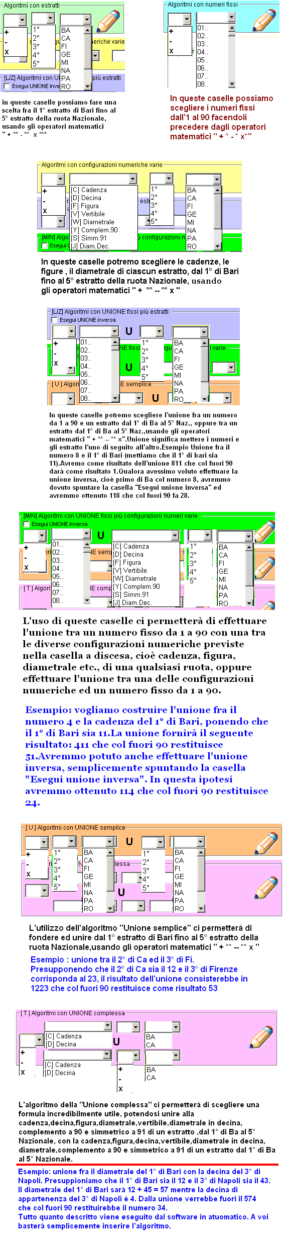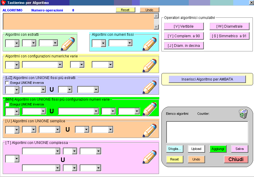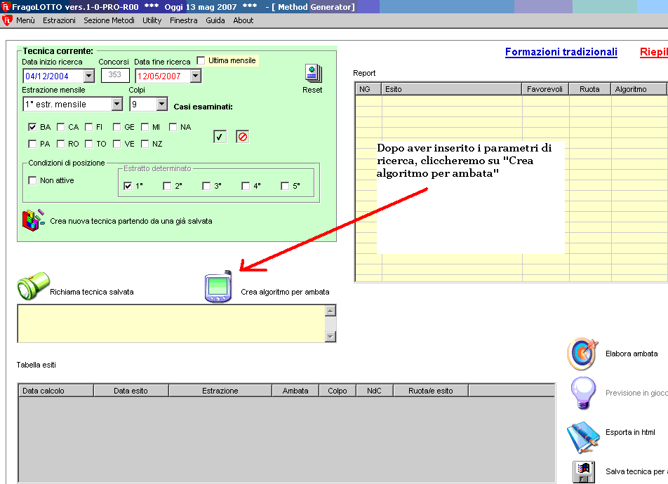 ha dell'inverosimile, dell'inimmaginabile. Immaginiamo per un attimo di voler implementare in tutta autonomia una tecnica che coinvolga la unione tra la figura del 3° estratto di Roma con la cadenza del 5° estratto di Venezia e di moltiplicare il risultato per il vertibile del diametrale in decina del 2° di Napoli : non potreste farlo con nessun altro software, solo FragoLotto sarà in grado di realizzare tecniche di questo tipo. Immaginiamo di voler realizzare una tecnica che coinvolga il diametrale in decina del 4° di Bari addizionato al simmetrico a 91 del 3° di Genova e sottratto alla unione fra la decina del 1° estratto di Firenze e il diametrale del 4° estratto di Napoli, il tutto ciclometrizzato col la funzione di vertibilizzazione dell'algoritmo completo: non potreste farlo con nessun altro software, solo FragoLotto sarà in grado di realizzare tecniche di questo tipo. Immaginiamoci la costruzione di una metodologia composta da 400 algoritmi fusi, frammisti, coordinati e che utilizzino nella stessa realizzazione il diametrale,il vertibile ,il complemento a 90, il simmetrico a 91, il diametrale in decina di un qualunque estratto, la decina, la cadenza,la figura di estratti, i numeri da 1 a 90, le unioni semplici fra numeri ed estratti, dirette ed inverse, fra estratti ed estratti, fra estratti e numeri ottenuti dall'utilizzo di vertibili,diametrali,complementi a 90, simmetrici a 91 :non potreste farlo con nessun altro software, solo FragoLotto sarà in grado di realizzare tecniche di questo tipo. Onde comprendere in maniera visuale quanto finora descritto, date uno sguardo attento alle immagini sotto riportate. Partendo dalla schermata principale di FragoLotto dopo l'impostazione dei parametri di ricerca,ci basterà cliccare sulla icona " Crea algoritmo per ambata"