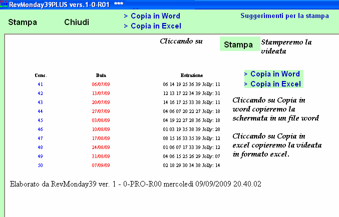 Facile,intuitivo,potente e senza rivali,innovativo nelle funzioni, RevMonday39 Plus è un software che realizza metodi legati al gioco della lotteria IRLANDESE a 39 numeri basato su concetti di linearità e di algoritmizzazione, in maniera del tutto automatica". Interattivo,corredato da funzioni automatiche,spettacolare nella grafica, RevMonday39 Plus è un vero portento che colloquia con l'utente, lo indirizza e gli indica le formule per "condurlo alla vittoria". Sono,infatti, pressoché infinite le tecniche di gioco creabili, e a corredo report COMPLETI indicanti l'affidabilità del metodo. I metodi realizzabili potranno basarsi: ***sugli indici mensili***sulla statistica continua***sulle spie semplici, complesse , SPIE ESTRAZIONALI, SPIE DIFFERENZIALI, SPIE DI SOMMA***sulle fasce-somma***. L'output