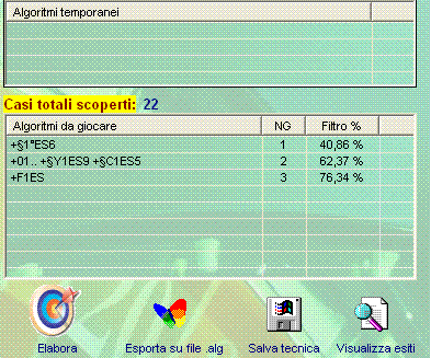Questo componente( vedi immagine sopra riportata) chiude la schermata del modulo "Lunghetta plus" e raccoglie i risultati del miglior algoritmo in base ai parametri da noi immessi. Ci  viene indicato quanti casi siano rimasti scoperti dalla terzina ( la informazione la trovate colorata in giallo,nel nostro caso ove trovate scritto il numero 22) e le percentuali di copertura( guardate sotto la colonna "Filtro%").Quel 40,86% indica i casi di copertura del primo algoritmo, mentre quel 62,37% indica la percentuale di copertura del secondo algoritmo ( algo 2 dei parametri della matrice integrale). In egual guisa,76,34% ( corrispondente all'algo F1ES) indica parimenti  la percentuale di copertura del terzo algoritmo calcolato dalla matrice di ricerca integrale.