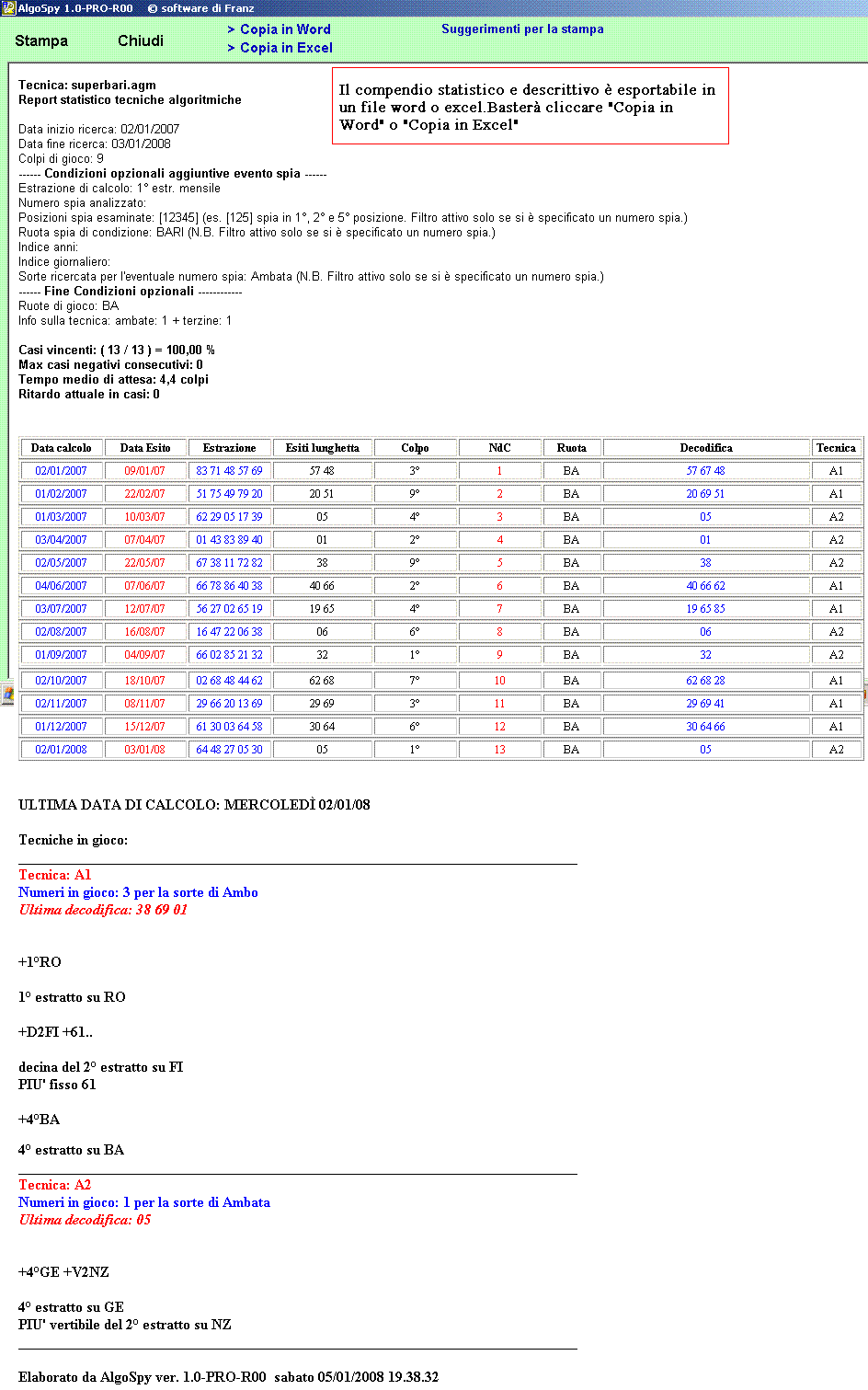 Noterete la presenza nel visualizza esiti della funzione Spoglio ,della funzione Spoglio multiplo,della funzione "Forza la data di calcolo". La funzione Spoglio ci permetterà di visualizzare gli eventuali esiti successivi alla data di fine ricerca di ciascuna MINItecnica realizzata ( A1,A2 etc),mentre quello multiplo consente di verificare i medesimi esiti con riferimento a tutte le MINItecniche considerate congiuntamente. La funziona "Forza la data di calcolo" permette all'utente,QUANDO ABBIA REALIZZATO UNA TECNICA , di scegliere come data di calcolo degli algoritmi una qualsiasi data precedente. In sostanza il calcolo algoritmico viene effettuato in date di calcolo. Con questa funzione potrete cambiare l'ultima data di calcolo e applicare ad essa il processo algoritmico. Immaginiamo di realizzare una tecnica a colpi zero, evento solitamente riscontrato nella sezione spie onde individuare gli abbinamenti ad un determinato capogioco,oppure immaginiamo più semplicemente che avessimo sognato il 34 come numero sortente su Venezia. Poniamo che volessimo abbinare al 34 non i ben conosciuti valori fissi,quanto algoritmi e immaginiamo che tale numero sortisca nella estrazione del 19 gennaio 2008. Ecco la grande utilità di tale funzione,non potendo computare gli algoritmi allorquando sortisca il 34, ma applicandoli ad una "x" estrazione precedente". Di default nelle tecniche della sezione algo a colpi zero il computo degli algoritmi viene effettuato nella estrazione precedente e tale criterio potremo anche noi seguirlo quando dovremo "forzare la data" usando al funzione che stiamo descrivendo. Ma immaginiamo che il 19 gennaio 2008 non sortisca il 34.Dove applicheremo gli algoritmi? Ecco che l'audace nostro pensiero ha realizzato questa routine implementandola nella casella di forzatura della data: potremo,così,inserire la data sempre precedente all'estrazione nella quale andremo a giocare o riferendola a x estrazioni prima,per una nostra intuizione anche se la logica esigerebbe che il calcolo avvenga come indicato dal processo di default: cioè estrazione precedente a quella di gioco. La icona a forma di "i" ci permetterà di visualizzare l'estrazione scelta nella casella di forzatura della data.