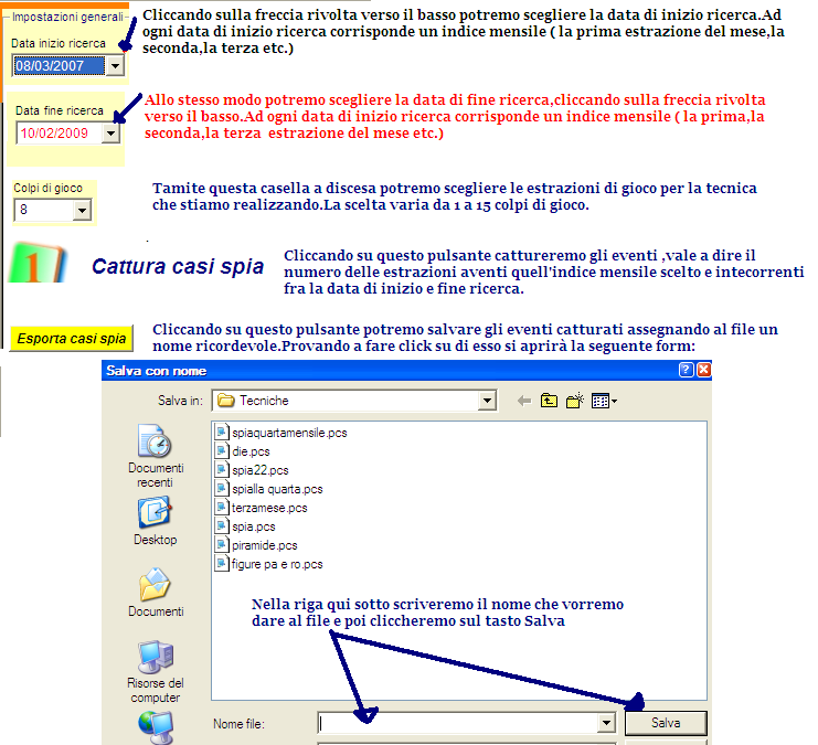 Chissà quante volte avete trovato sui giornali di settore metodi e tecniche calcolate ad ogni prima,oppure ad ogni seconda,terza,quarta etc. estrazione del mese. Ebbene con LottoEasy potremo realizzare metodologie che si basano esattamente su una estrazione del mese di nostra scelta,dalla prima all'ultima e potremo anche realizzare metodi basati sul parametro "qualunque estrazione". Questo parametro impartisce a LottoEasy l'ordine di considerare tutte le estrazioni contenute fra due date: la data di inizio ricerca e la data di fine ricerca. Qualora,invece,scegliessimo come parametro la prima estrazione del mese,LottoEasy catturerebbe tutte le prime estrazioni del mese intercorrenti tra la data di inizio ricerca e la data di fine ricerca. Qualora,invece,scegliessimo come parametro la seconda estrazione del mese,LottoEasy catturerebbe tutte le seconde estrazioni del mese intercorrenti tra la data di inizio ricerca e la data di fine ricerca. Questo modo di operare sopra descritto è applicabile similmente a ciascuna estrazione del mese che si vorrà catturare. Passi da eseguire per catturare le estrazioni con un proprio indice (la prima,la seconda,la terza etc). Primo passo : inseriremo una data di inizio ricerca scegliendola dalla casella a discesa. Secondo passo : inseriremo una data di fine ricerca scegliendola dalla casella a discesa. Terzo passo : inseriremo i colpi di gioco. Quarto passo : cliccheremo sulla icona a forma di "1" ( Cattura eventi spia). Quinto passo : cliccheremo sul pulsante "Esporta casi spia",attribuendo un nome al file che si sta salvando. Quando scegliamo la data di inizio ricerca noterete che la casella "indici temporali" si valorizza indicandoci che a quella data estrazionale corrisponde quella specifica estrazione mensile. Potremo o accettare tale scelta oppure usando la casella a discesa degli indici temporali selezionare una estrazione mensile diversa. Il mio consiglio è quello di posizionarvi ad una data di inizio ricerca che indichi lo stesso indice mensile della data di fine ricerca. Ad esempio,ora siamo alla quinta estrazione del mese,allora potremo scegliere come data di inizio ricerca una quinta estrazione di un qualunque mese e anno. In questo modo potremo ottenere la previsione in corso. Nulla vieta che potremo liberamente posizionarci su qualsiasi data di inizio e fine ricerca e catturare l'evento: sarà il software ad indicarci l'estrazione di calcolo mensile nel compendio statistico e descrittivo che più avanti avremo modo di visualizzare. Nota: nello scegliere la data di inizio ricerca, ricordiamoci della giovine vita del compartimento Nazionale sul quale la prima estrazione risale al 4 maggio 2005.Quindi,qualora decidessimo di catturare un range di estrazioni per poi verificarlo(nella sezione previsione)sulla ruota Nazionale dovremo aver cura ch'esso si riferisca non a estrazioni succedutesi prima del mese mariano (maggio) del 2005.