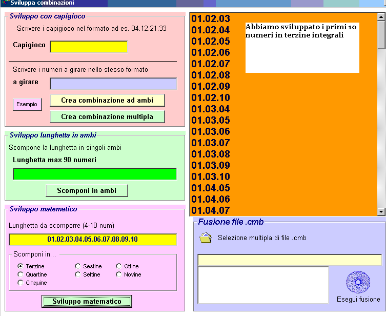 considerando tutte le possibili combinazioni. "Sistemi ortogonali". Con tale definizione ci riferiamo allo sviluppo di una serie numerica ,o lunghetta,sottoforma di sistemi in terzine,quartine,etc. la cui peculiarità è quella di organizzare tutte le combinazioni numeriche non ripetendone le sorti,per quanto risulti matematicamente possibile. In sostanza,nei sistemi ortogonali oltre ad evitare inutili ripetizioni di combinazioni,non si effettuano riduzioni di combinazioni,in quanto,ad esempio,un sistema ortogonale per ambo di 12 numeri garantirà sempre la vincita di un ambo alla sortita di almeno 2 numeri fra quelli previsionati. Una volta creato il sistema,utilizzando uno qualunque dei metodi,lo possiamo salvare sottoforma di file in modo da poterlo successivamente richiamare per altri scopi.I numeri vanno inseriti nel formato ad esempio 04.23.43.21 cioè separati da un punto e sempre in doppia cifra. Es. 5 va scritto come 05.