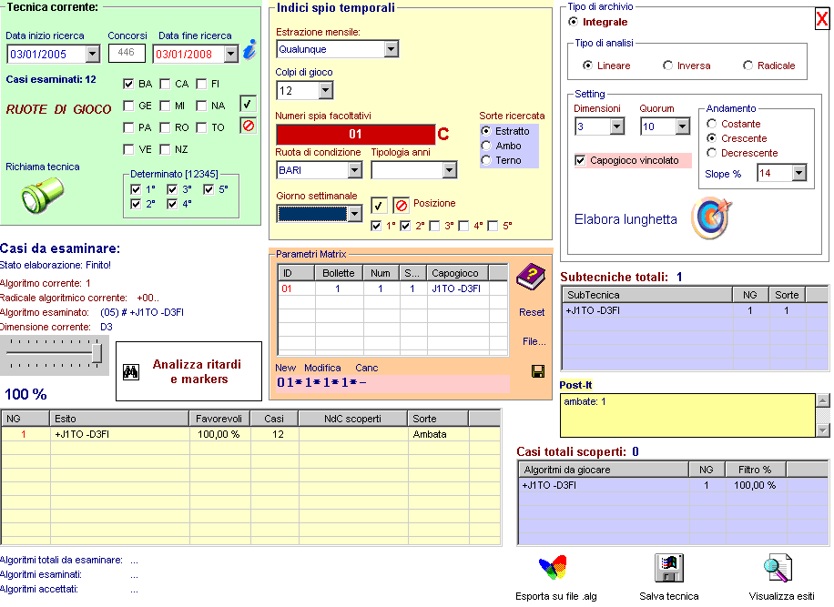Fate bene attenzione : la funzione dei markers permette le indagini sulla ruota legata ad un processo di elaborazione di una tecnica con la matematica algoritmica. Quindi se abbiamo realizzato una tecnica su Milano,ad esempio, andando nella sezione dei markers qualunque elaborazione,qualunque ricerca dei precursori di un numero o più numeri si riferirà soltanto alla ruota di Milano. Parimenti,qualora noi avessimo realizzato una tecnica su due ruote,i markers concernerebbero solo la prima delle due ruote presa in ordine alfabetico. Esempio,poniamo di aver realizzato un metodo su Cagliari e Venezia, andando nella sezione markers facendo la ricerca dei precursori di un numero a nostra scelta,essa riguarderà solo la ruota di Cagliari. Va da sé che modificando la ruota di gioco nel pannello dei parametri esigerà che venga elaborata la tecnica. Una volta eseguito questo step potremo passare alla sezione markers e fare le verifiche sulla medesima ruota dei nostri precursori. L'analisi dei markers è abbastanza semplice bastando inserire i colpi a ritroso che formano i blocchi estrazionali in ciascuno dei quali verranno individuati i migliori markers,o precursori;il numero del quale ricercare i precursori, i gruppi di precursori,le presenze e i gli eventi o casi di numero ricercato del quale individuare i precursori.