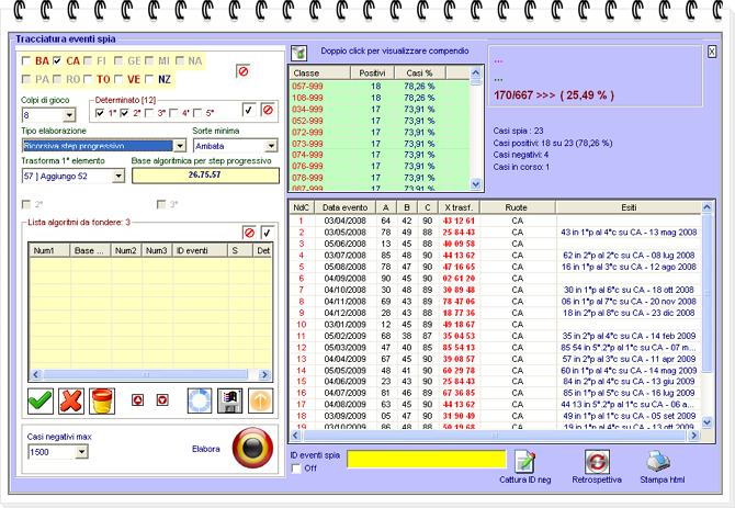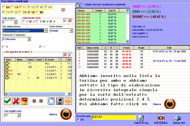 Questa forma di esame non comporta grossi problemi di comprensibilità, né necessita di eseguire settaggi particolarmente difficili. Non dovremo richiamare alcun evento spia in quanto l'abbiamo già caricato nella sezione della circuitazione. Certamente avremo la necessità di indicare la ruota o le ruote di gioco, la sorte se di ambata o estratto determinato, oppure di ambo o di terno, oltre alla indicazione dei colpi di gioco.