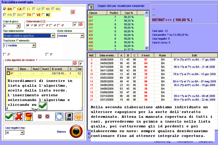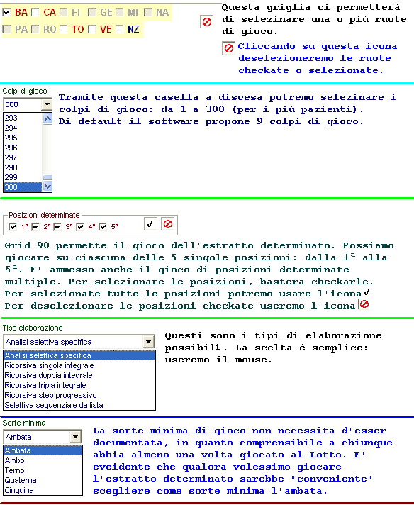 Selettiva sequenziale da lista = analizza gli output sulla base di una tecnica mista, ottenuta dalla fusione di più tecniche ciascuna composta da propri algoritmi. Infatti, nel mentre stiamo implementando un metodo per ambata su ruota, possiamo estendere l'analisi valutando un ambo su tutte tale che, aggiunto al capogioco, riesca a garantire la copertura di ogni evento, di ogni accadimento catturato. Tale funzione consente di creare metodi "multisorte" e la sua efficacia non è, allo stato,proponibile da alcun software esistente al mondo.
