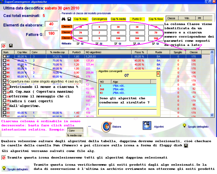 Noterete come gli algoritmi della griglia viola siano stati trasformati nei relativi controvalori, in gergo le previsioni. Di ciascuna previsione, ma indirettamente di ciascun algoritmo, la funzione delle Superconvergenze traccia parametri interessantissimi ciascuno dei quali è accolto nella relativa colonna. Il parametro che subito balza all'occhio è quello delle convergenze. Posizionato in cima troviamo il numero 7 per il quale ci sono 3 algoritmi diversi che conducono a tale numero: perciò le Conv ( le Convergenze) sono pari a 3. Se qualcuno chiedesse: ma come faccio a sapere quali sono quali algoritmi che conducono tutti e 3 al risultato sette? Semplice. Selezioniamo la riga inerente il Num (Numero) 7, poi clicchiamo sulla icona Algoritmi: