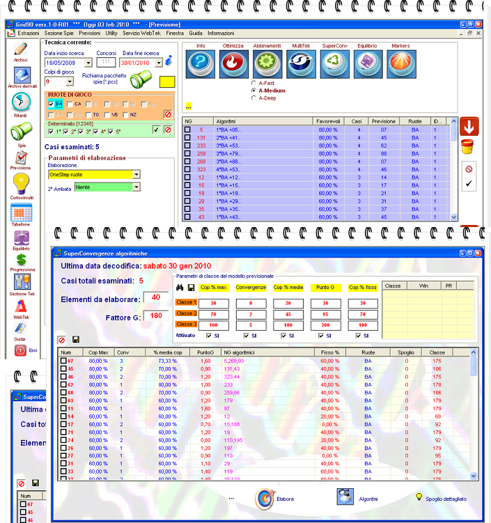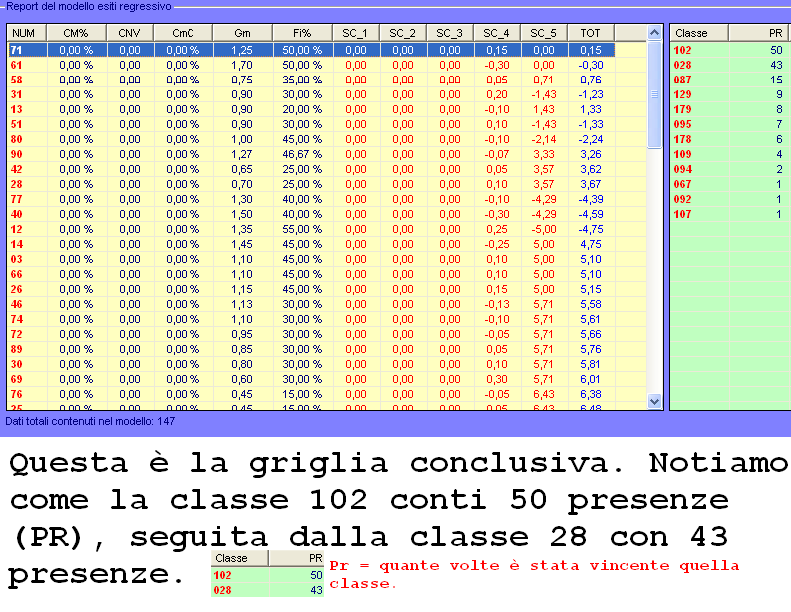 Questa routine implementata in Grid 90 consente di individuare convergenze fra formule algoritmiche, una volta che le stesse siano state dapprima trasformate in valori numerici e di individuare modelli previsionali applicati ad una serie omogenea di accadimenti spia.