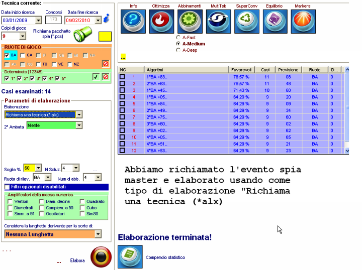 4)andiamo di nuovo nella sezione Previsione e qui richiamiamo il nostro sub evento spia n. 3. Scegliamo come tipo di elaborazione Richiama una tecnica (*alx) e usiamo il file tecnica salvato al punto 1. Elaboriamo e immediatamente dopo rechiamoci nella sezione Superconvergenze. Qui clicchiamo sul tasto Elabora e salviamo il modello ( Salva Modello esiti positivi). Useremo lo stesso nome attribuito nella fase precedente;