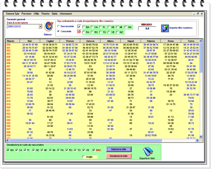 La parte alta del tabellone ci riserva anche un'altra sorpresa: possiamo scegliere un range numerico entro un certo intervallo numerico. In sostanza, immaginiamo di voler salvare un file contenente sol quei numeri con ritardo compreso fra le 10 e 40 estrazioni. Dovremo, in primis, scegliere la ruota (Basterà checkare una più caselline), in seconda istanza dovremo scrivere il range del ritardo (Casella Min - Max), e poi cliccare sul pulsante esporta filtro numerico (Pulsante a forma di floppy disk). Il file che salveremo avrà estensione .cmb e potrà esserci utile in altre sezioni del software, come nel modulo dei ritardi e frequenze specifiche.