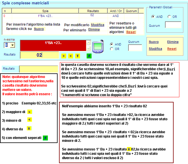 In LottoDix Plus il modulo "spie complesse MATRICIALI" è accessibile nella medesima "sezione delle spie" . Affinché risulti possibile realizzare una tecnica basata sui di essi sarà necessario selezionare l'option button che troverete nelle "impostazioni generali" denominato "Spie complesse MATRICIALI". TUTTI I CASI SPIA ELABORATI POTRANNO ESSERE ESPORTATI NELLA SEZIONE "PREVISIONE" ONDE ESSERE PROCESSATI AL FINE DI OTTENERE LE MIGLIORI PREVISIONI PER IL NUOVO GIOCO "10 E LOTTO" E POTRANNO ESSERE UTILIZZATI NEGLI ALTRI NOSTRI SOFTWARE CHE PREVEDONO ANALISI DI EVENTI SPIA. N.B. le spie matriciali complesse sono quelle che utilizzano IL TASTIERINO ALGORITMICO O TASTIERINO NUMERICO. Infatti,è lì che verranno inserite le formule dalle più semplici alle più complesse. Cosa è una spia algoritmica complessa MATRICIALE ? Conosciamo bene gli eventi spia semplici,sortita di un numero qualunque,di un ambo o terno spia,ma avremmo delle difficoltà a capire cosa mai possano essere eventi del tipo: quando il 1° di Bari moltiplicato la vertibile del 2° di Genova ed unito alla decina del 4° di Roma dia come risultato 45, e nella stessa estrazione sortisce il 24 su Venezia cosa dovremo giocare su BARI? Ebbene,questo caso rappresenta esattamente un evento spia complesso. Col nostro tastierino potremo creare miliardi di tali eventi,dai più semplici ai più complessi,utilizzando ogni forma di algoritmo,dalle unioni alle cadenze,dai vertibili ai diametrali in decina,alle k-distanza . Lo stesso strumento del tastierino numerico sarà in grado di farci elaborare ogni tipo di evento ANCHE CICLOMETRICO,come la sortita di due ambi di distanza, o somma, su una, due o più ruote; eguaglianza tra figure; eguaglianza tra decine e cadenze;valori piramidali e di radice quadra; eguaglianza di numeri su due o più ruote rispetto ad una lunghetta etc. Ora spieghiamo le funzionalità delle componenti le spie matriciali complesse.( vedere immagine sotto)