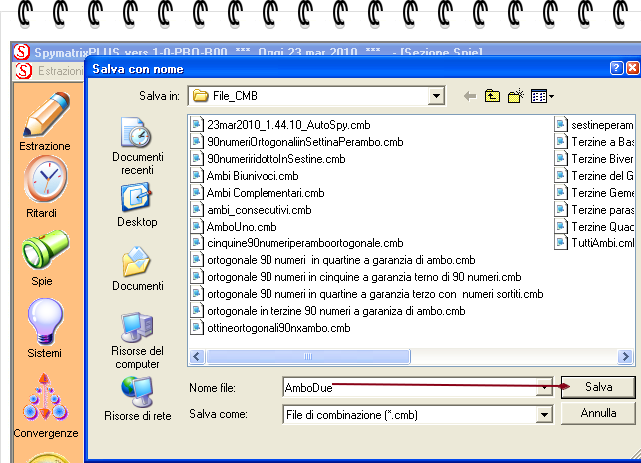 La combinazione di ambo (notate che copre 1 casi su 1, cioè il periodo perdente esportato) dovremo salvarla. Per farlo basterà selezionarla e poi fare click sul pulsante Crea.Cmb. Attribuiremo un nome (AmboSei):