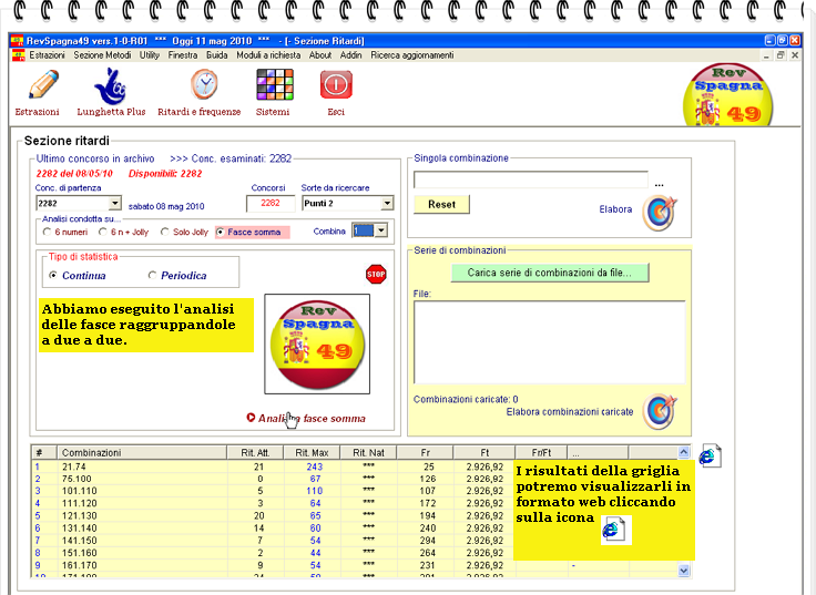 La correlazione con il modulo di costruzione della tecnica è evidente: infatti, una volta che avrete realizzato la tecnica ed ottenuto le eventuali previsioni in corso, accedendo alla funzione che stiamo discutendo potrete verificarne la frequenza o il ritardo e decidere se porle in gioco in base al personalissimo criterio col quale siete portati a scegliere le combinazioni.