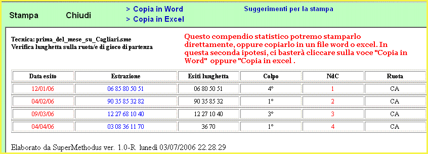 quest'ultimo caso si evidenzieranno gli esiti sortiti con gli abbinamenti a quaterna, nel primo caso verranno evidenziati gli esiti della lunghetta composta dall'algoritmo a ambata al quale siano uniti gli algoritmi per accoppiamento ad ambo, terno e quaterna. Per la verifica degli