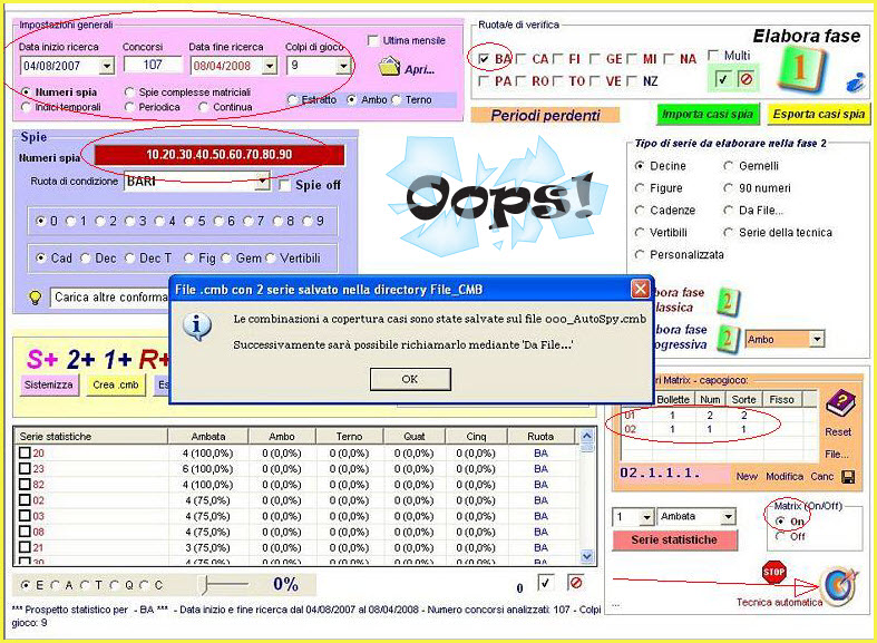 Data inizio ricerca: 04/08/2007 Data fine ricerca: 08/04/2008 Numero concorsi analizzati: 107 Evento Numeri spia: sortita di ambo della cadenza zero sulla ruota di Bari Ruota di condizione e colpi di gioco: BARI 9 colpi. Ruote di verifica e di gioco : - BA Matrix on cioè valorizzata ( si spunta la check box)