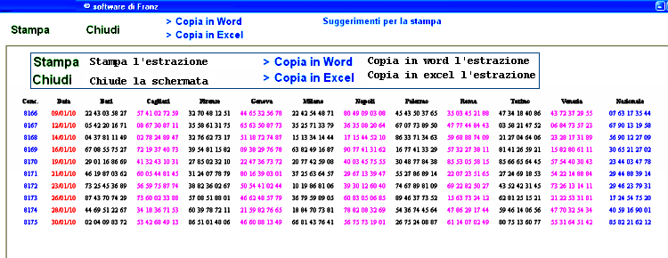 Qualora volessimo avere la visione di più di una estrazione,sempre rimanendo nel pannello che stiamo esaminando,ci basterà cliccare sul pulsante "LOTTO". Ci apparirà una form nella quale potremo scegliere il gruppo di estrazioni da visualizzare ( le ultime 2,3,4,5,6,7 etc. estrazioni),avendo anche la possibilità di scegliere la visualizzazione per singola ruota o per ruote multiple in base alle nostre esigenze. Le estrazioni che avremmo scelto di visualizzare potremo anche stamparle su carta per averne memoria, oppure salvarle su un file word o excel ,da riprendere successivamente in base alle nostre esigenze.